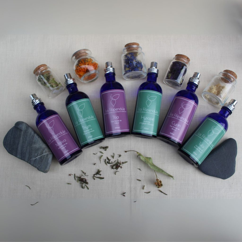 La gamme de La Filipendule est aujourd’hui composée de trois types de produits, les hydrolats et eaux florales, les soins de la peau et les sirops médicinaux. D’autres produits sont envisagés pour la saison 2025 et sont actuellement à l’étude comme les alcoolatures, connues aussi sous le nom de teintures mères.